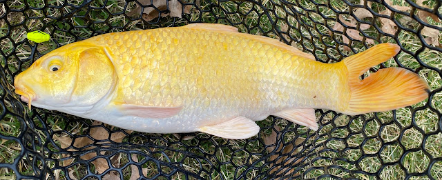 It wasn't a fish every cast, but it was pretty steady all morning until I finally decided to give the fish a reprieve from me. I ended up catching 13 Koi and (surprise!) 7 Goldfish in 2 hours of fishing! It was really fun. Getting them to strike was pretty awesome, but seeing them up close with the variety of colors and scale patterns was stellar! If you know a little about Carp, you may know there are the common scale pattern variety, a "mirror carp" variety that has scales of different sizes and shapes that may be patchy, in lines, etc. And then there are Leather Carp that have few or no scales. I caught all of those varieties, with the color patterns of Koi. Cool!