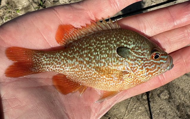 After work on Tuesday, I did some errands, and then fished for a bit after the rain passed. Saw a big fat Redear, but it swam away when I put my fly near it. I managed to catch another Redear, though. And a Largemouth Bass, and a couple Hybrid Sunfish.