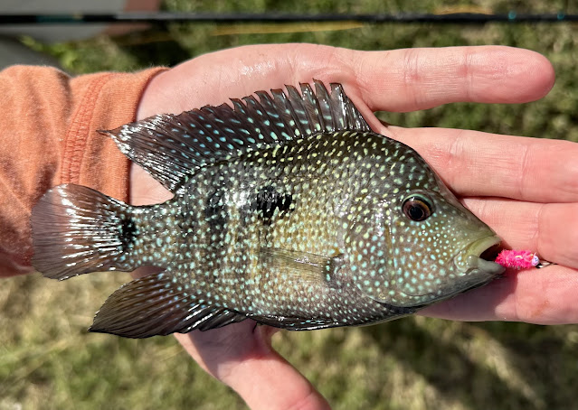 In the freshwater urban creeks in New Orleans, I caught Rio Grande Cichlids, Green Sunfish, Bluegill, and Largemouth Bass. The 4 pics below are Rio Grande Cichlids. They are native to Texas, but not native to Louisiana.